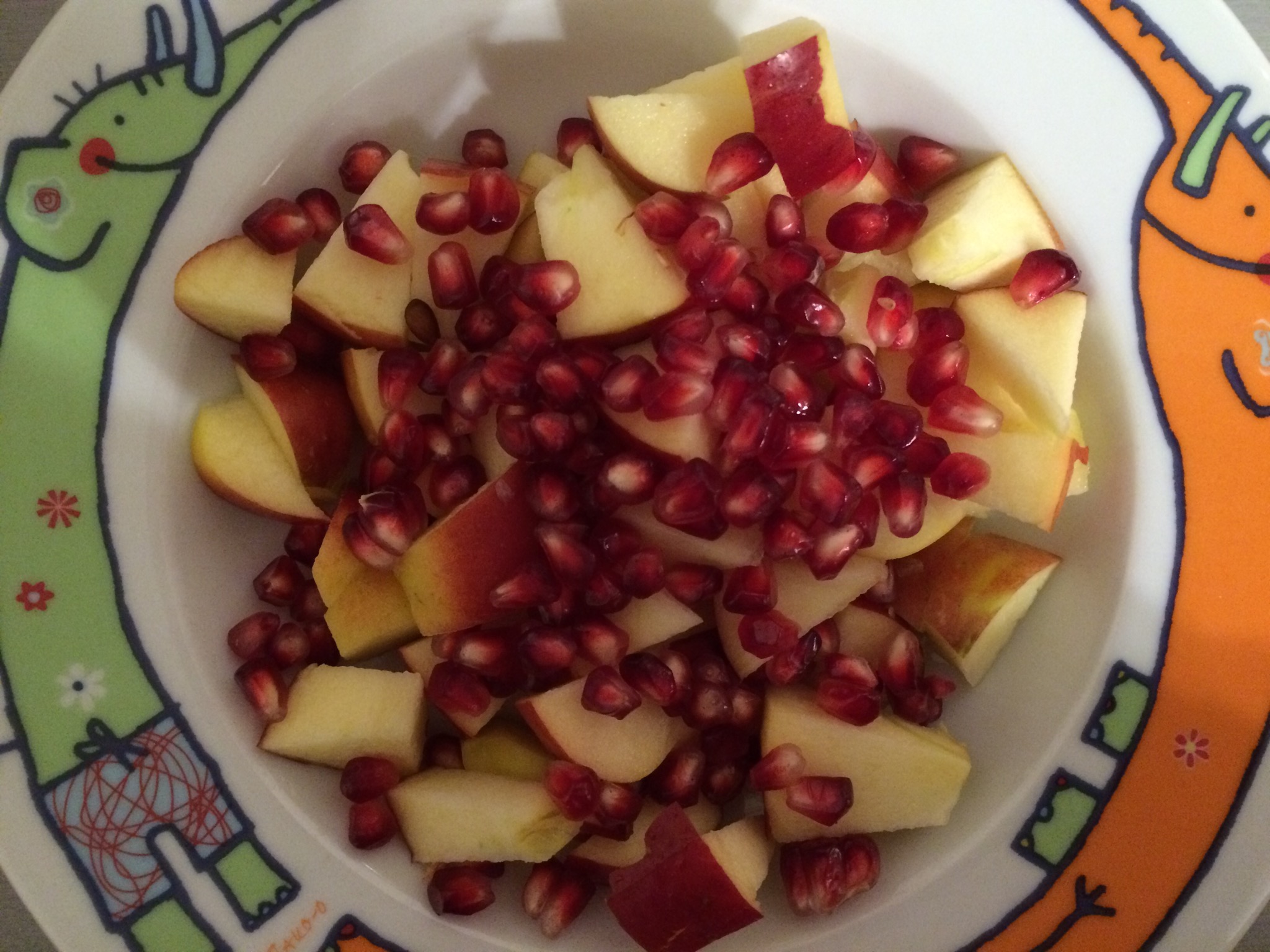 Zum Abendessen habe ich mir Tomatensalat gemacht und als Nachtisch habe ich Apfelstücke geschnitten und einige Granatapfelstücke dazu gegeben. Dann eine Soße aus Mandelmus mit Dattel und Wasser darüber gegossen und mit Carobpulver „verziert“. Die Anregung dafür habe ich von Silke Leopold. Das war sehr lecker. Die Soße wird ab sofort mein Vanillesoßeersatz. Bisschen Vanille noch dazu und sie ist perfekt dafür geeignet.