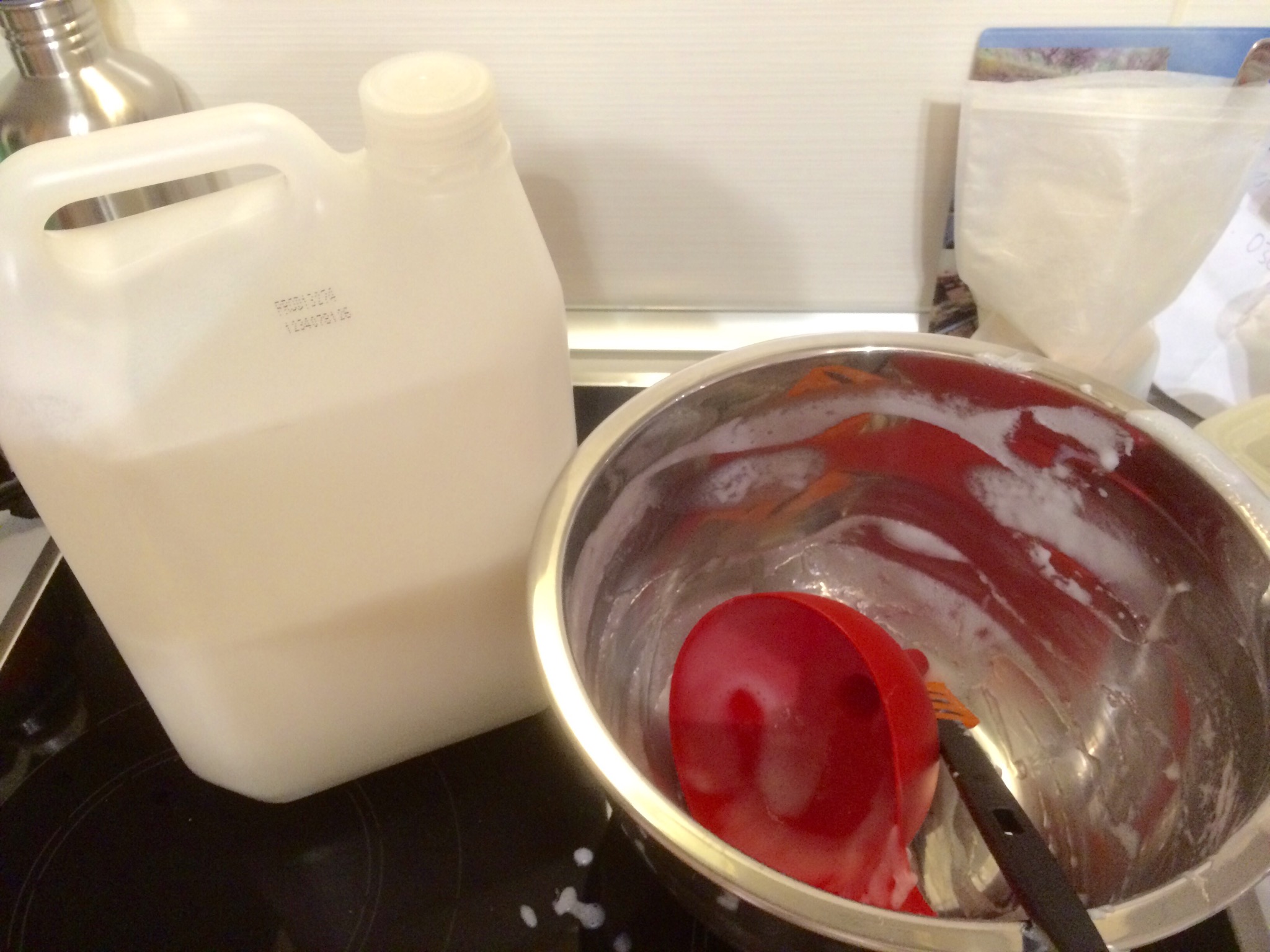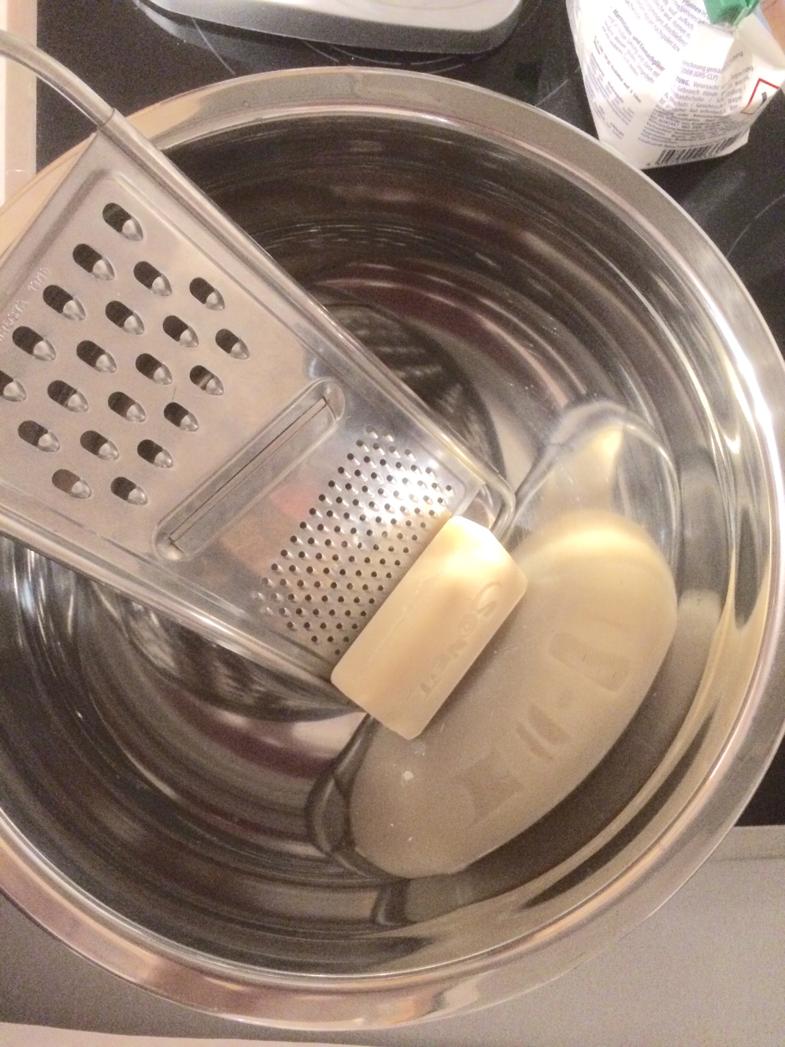 Das Waschmittel mache ich jetzt übrigens von dem ganzen Stück Seife und habe dann einen 5 Liter Kanister mit etwas mehr als 4 Liter Waschmittel voll. Das reicht dann eine Weile. Der Zeitaufwand für das Reiben und Mixen ist akzeptabel. Es dauert etwa 10 Minuten und dann muss man nach einer Stunde nochmal mit Wasser aufgießen. Zwischendurch ab und zu schütteln. Ich finde es unglaublich einfach und frage mich warum ich das nicht schon längst gemacht habe. Hier ein paar Bilder vom letzten Mal.