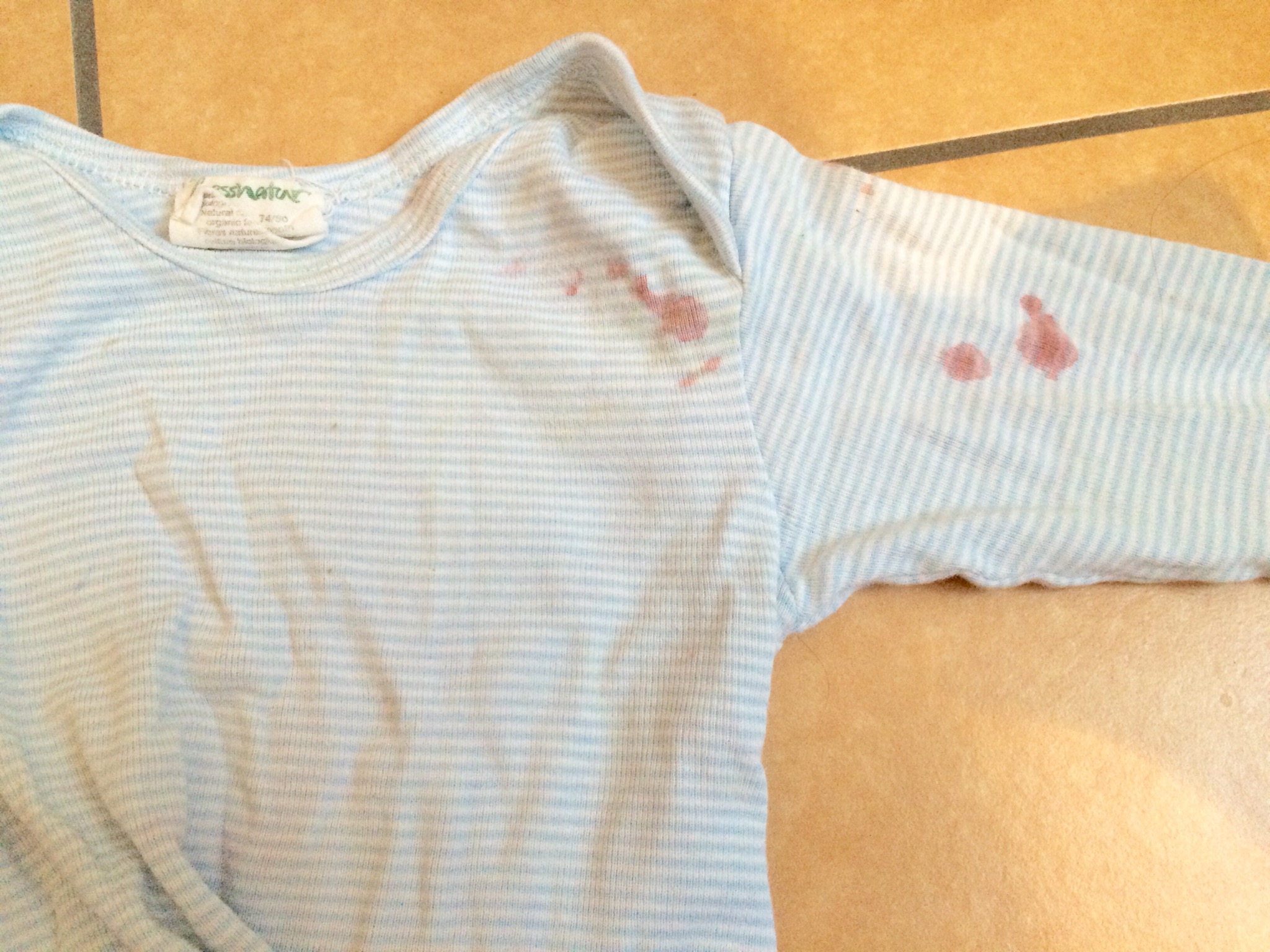 Nun noch zur letzten Frage nach den Flecken. Ich habe einen Pulli mit Granatapfelflecken gehabt. Bei solchen Flecken gebe ich Fleckensalz (von Ulrich) dazu oder in dem Fall habe ich einfach ein bisschen flüssige Gallseife auf den Fleck gemacht. Dann ab in die Maschine und hier seht ihr die vorher-nachher-Bilder.