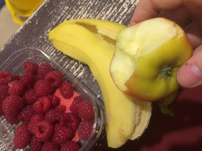 Mittwoch – Zum Frühstück gab es ausnahmsweise mal eine Banane, einen Apfel und ein paar Himbeeren. Als Nachtisch eine Tafel Rohkostschokolade.