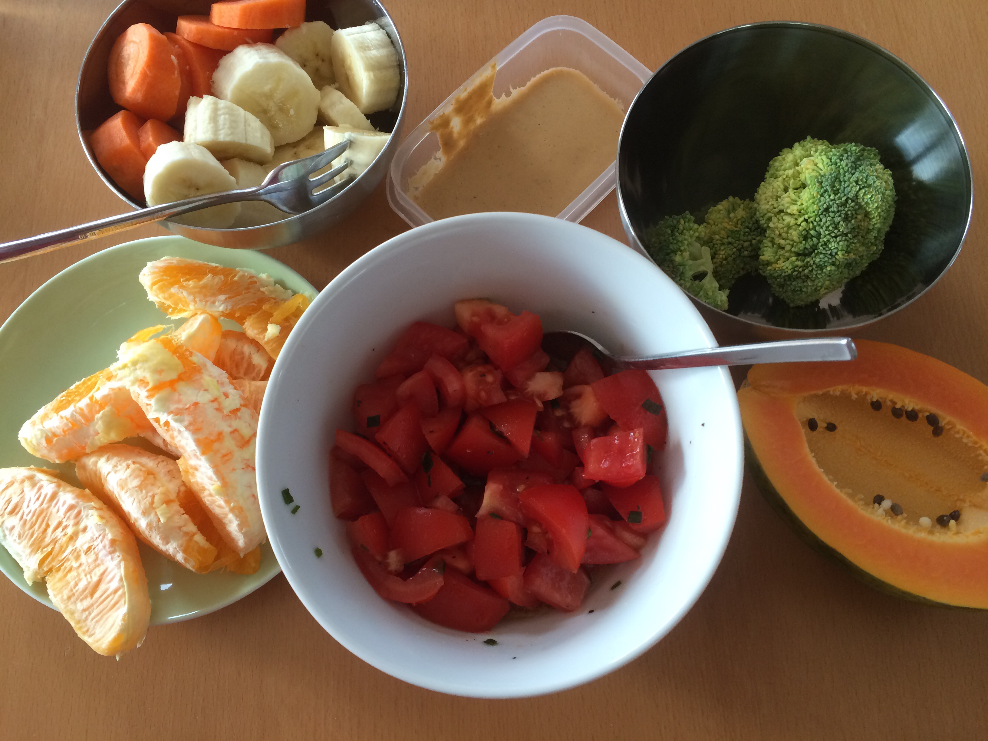 Nachmittags gab es Tomatensalat und ein bisschen weitere Rohkost und ich habe ein paar Kartoffeln gegessen.