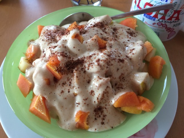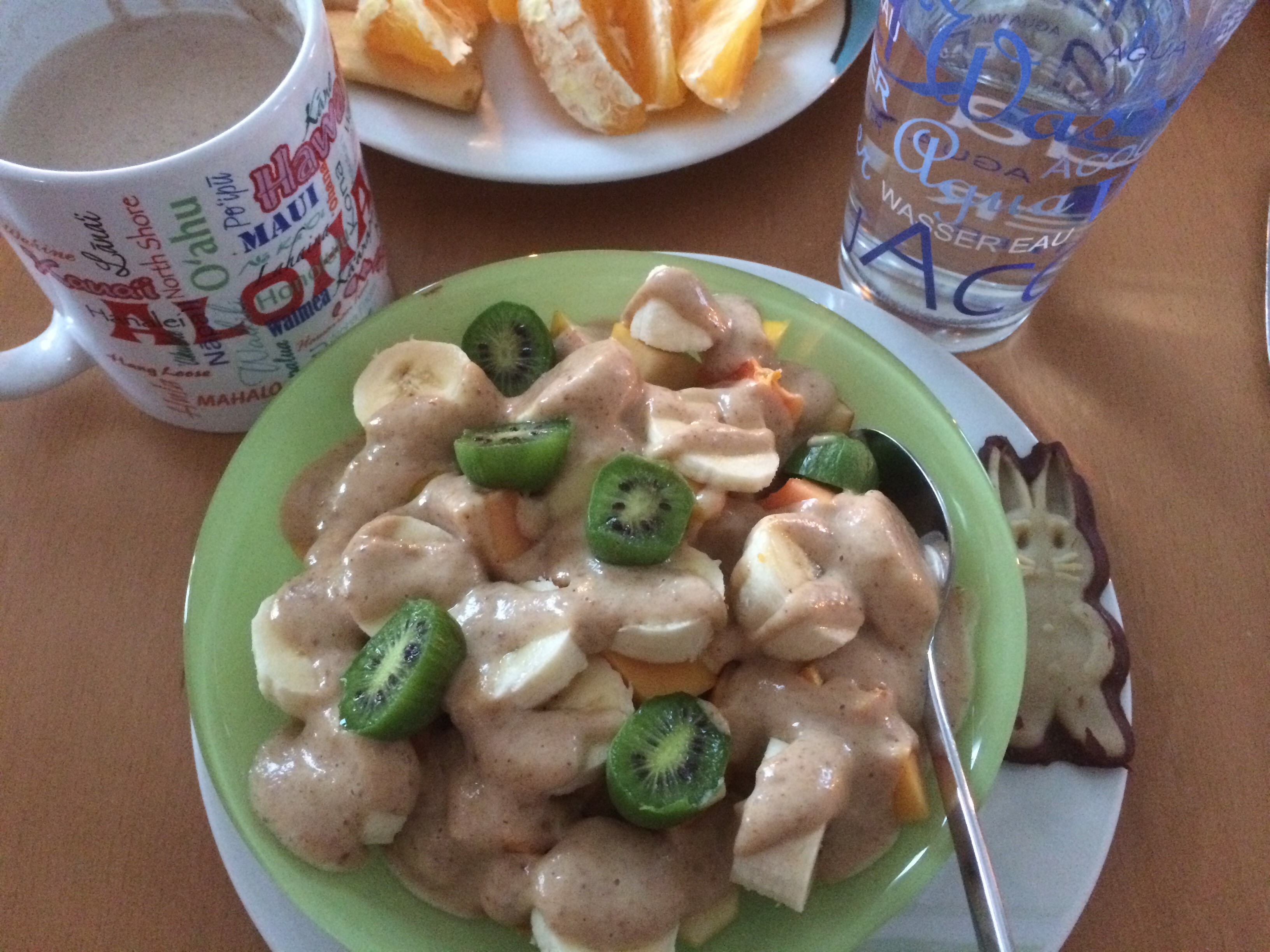Donnerstag – Mein Frühstück bestand wie immer aus mit Apfelsaft eingeweichten Haferflocken. Darüber mache ich Obst (meist einen Apfel und eine Banane). Über das Obst mache ich eine Soße aus Nussmus, Wasser und Dattel (optional kommt in die Soße manchmal Vanille, Nelkenpulver oder Kakao/Carob).
