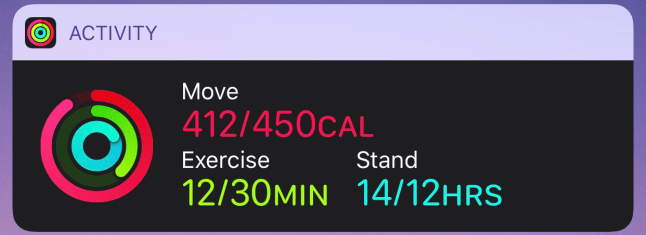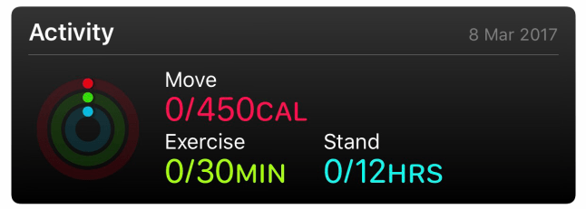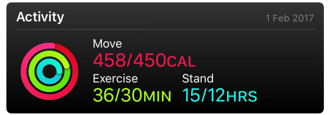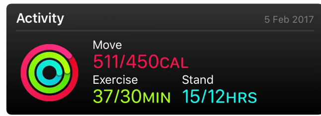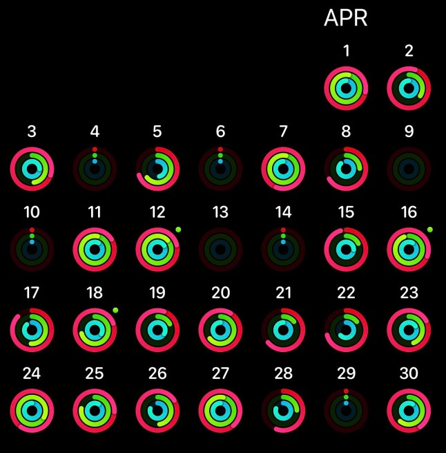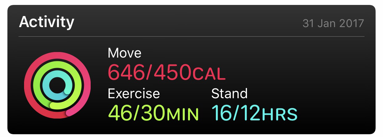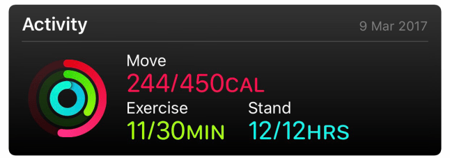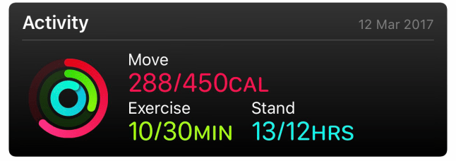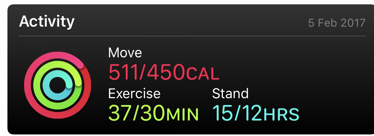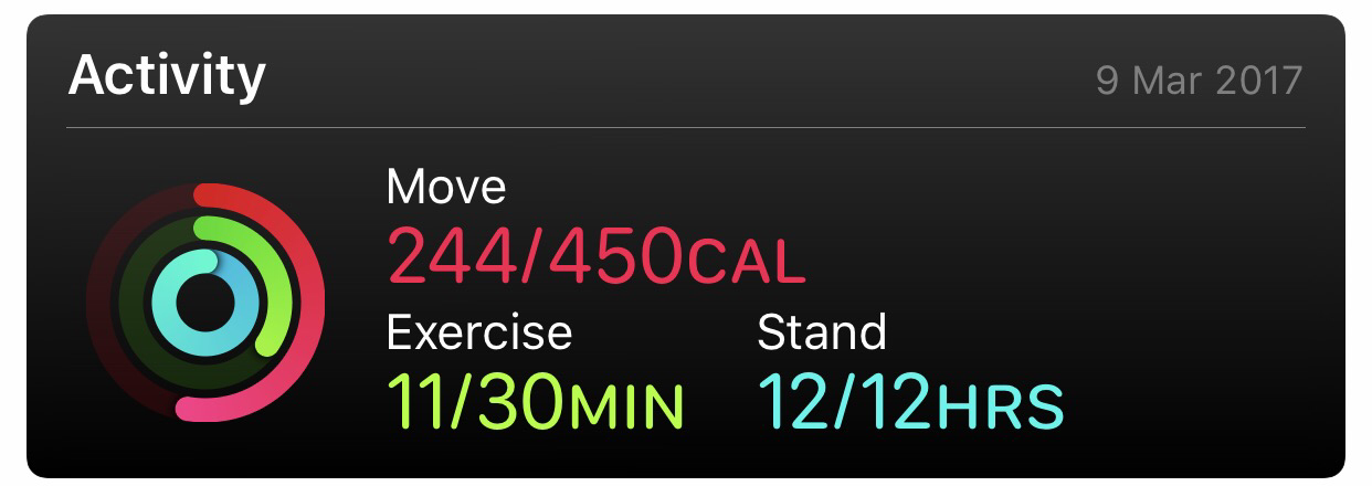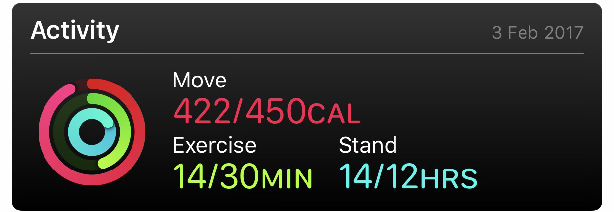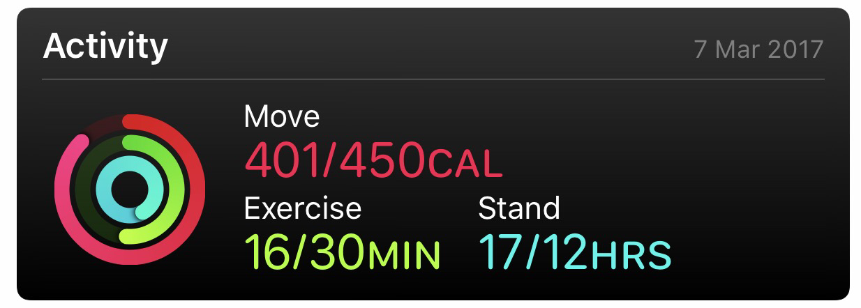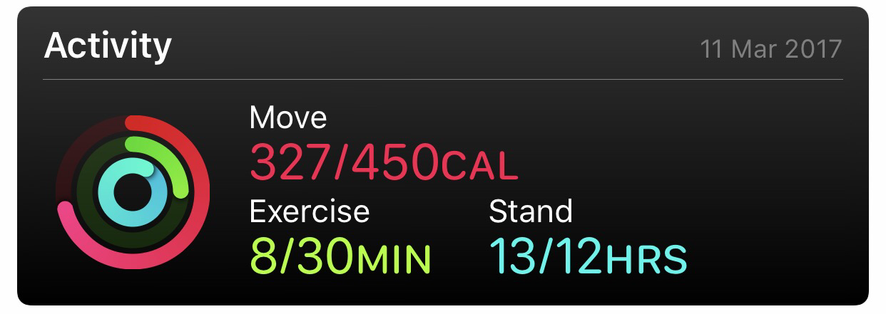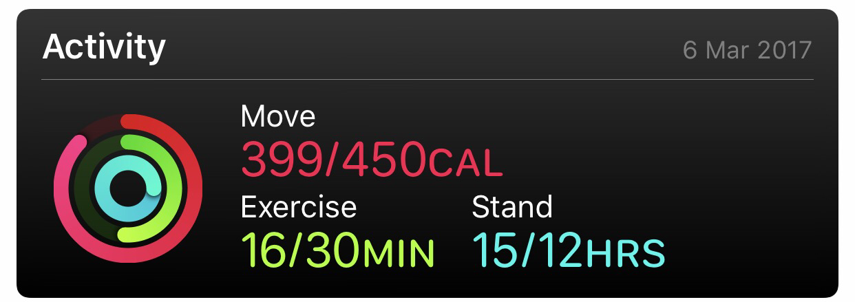 Legende: rot ist das Bewegungsziel von 380 Kalorien, grün sind die 30 Trainingsminuten und blau zeigt an ob ich tagsüber regelmäßig gestanden habe und nicht ausschließlich gesessen oder gelegen.