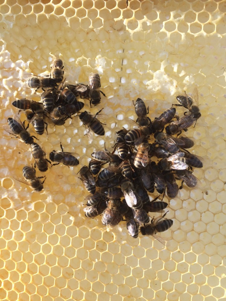 Dann werde ich ihnen eine Königin zeigen (hoffentlich) und die Bienen und Drohnen. Wir sehen uns eine Honigwabe, eine Wabe mit Bienenmaden und eine Wabe mit verdeckelten Waben an.
