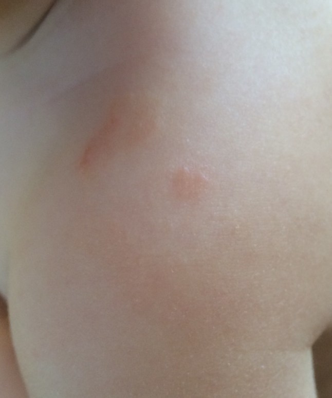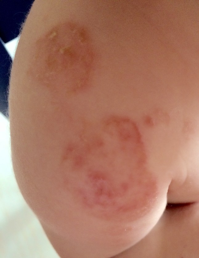 Beide Stellen sind etwas heller geworden und die größere Stelle ist weniger verkrustet. Die Haut ist da bereits glatt. Leider hat die Kleine gestern ein bisschen gekratzt, so dass es ein bisschen gekratzt aussieht, aber eine Besserung ist deutlich zu sehen finde ich.