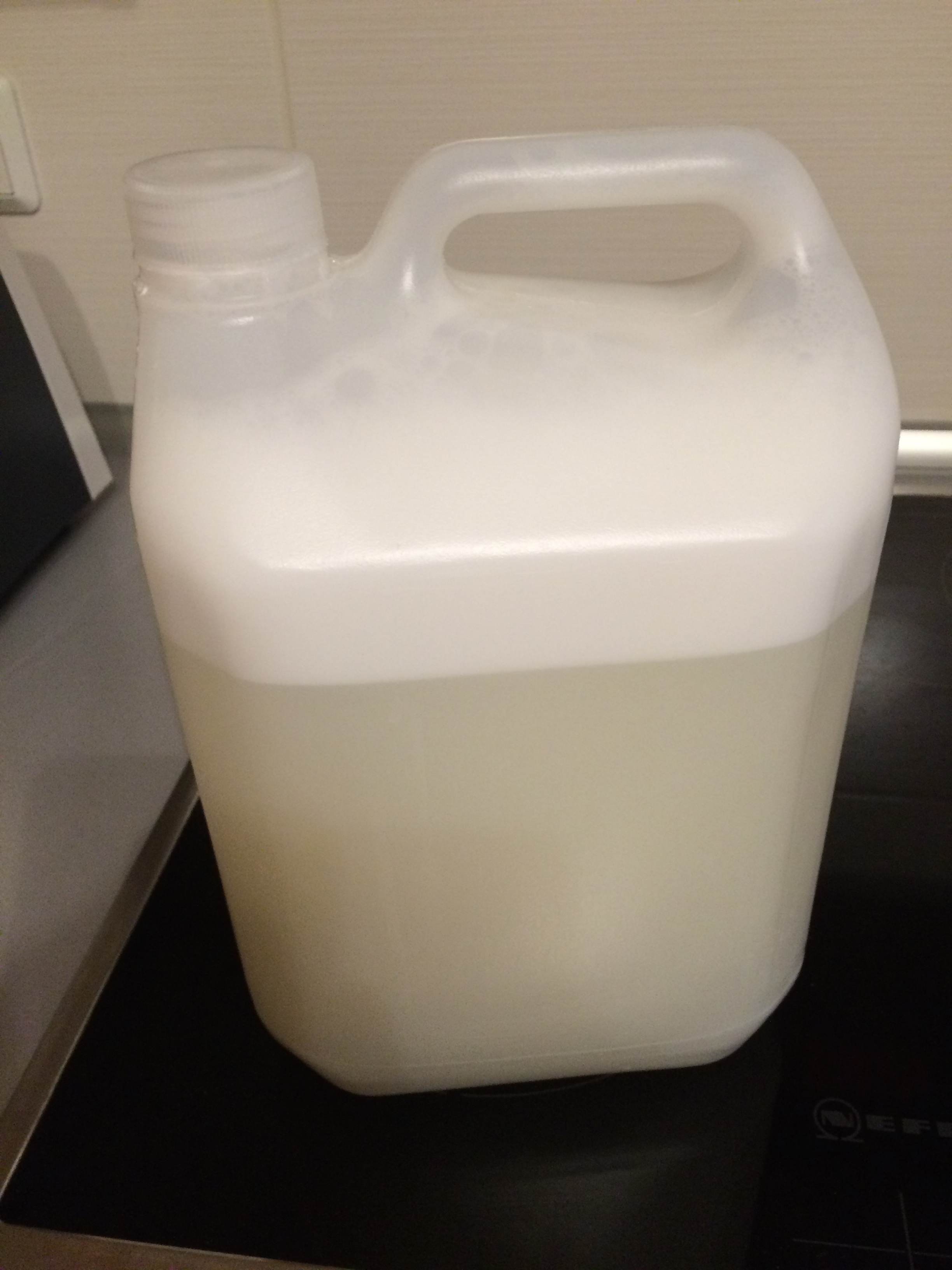 Das Waschmittel mache ich jetzt übrigens von dem ganzen Stück Seife und habe dann einen 5 Liter Kanister mit etwas mehr als 4 Liter Waschmittel voll. Das reicht dann eine Weile. Der Zeitaufwand für das Reiben und Mixen ist akzeptabel. Es dauert etwa 10 Minuten und dann muss man nach einer Stunde nochmal mit Wasser aufgießen. Zwischendurch ab und zu schütteln. Ich finde es unglaublich einfach und frage mich warum ich das nicht schon längst gemacht habe. Hier ein paar Bilder vom letzten Mal.
